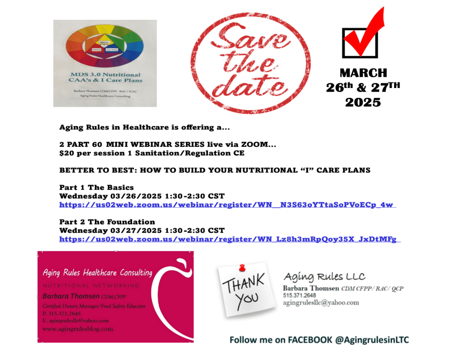 The process of documenting resident cares has been a journey filled with many potholes, roundabouts and crossroads. Culture changes terms of endearment, Resident Centered or Person Directed Cares, that have yet to become a reality in the institutionalized, traditional medical model of long term care facilities. Lucky for our residents we have kept on the path of continuous progress, never arriving at a dead end, but arriving at numerous crossroads. I will be offering a two part series via Zoom on how to get the “I” into your resident’s nutritional plan of care. Sign up below